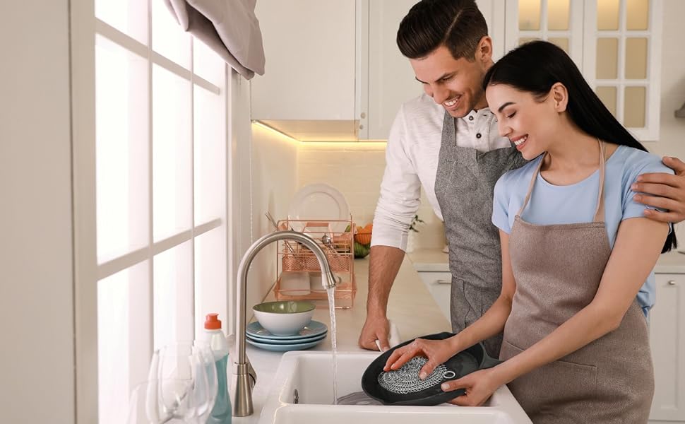 【EASY TO USE, CLEAN AND STORE】Circular design enable central& outer rings superior grip. Chainmail ring size enables effective cleaning residue. Ring to hang on a hook after washing. Dishwasher safe