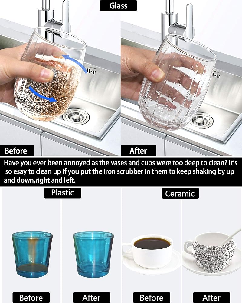 【HEALTH AND SAFE】Are you still in use traditional steel balls and sponges? Reusable chainmail scrubber won't break, shed fibers or smell like traditional pot cleaners. This Anti-rust scrubber has round and smooth surface, no burrs and no slag, keeps itself completely clean and odorless. A healthy life is easy