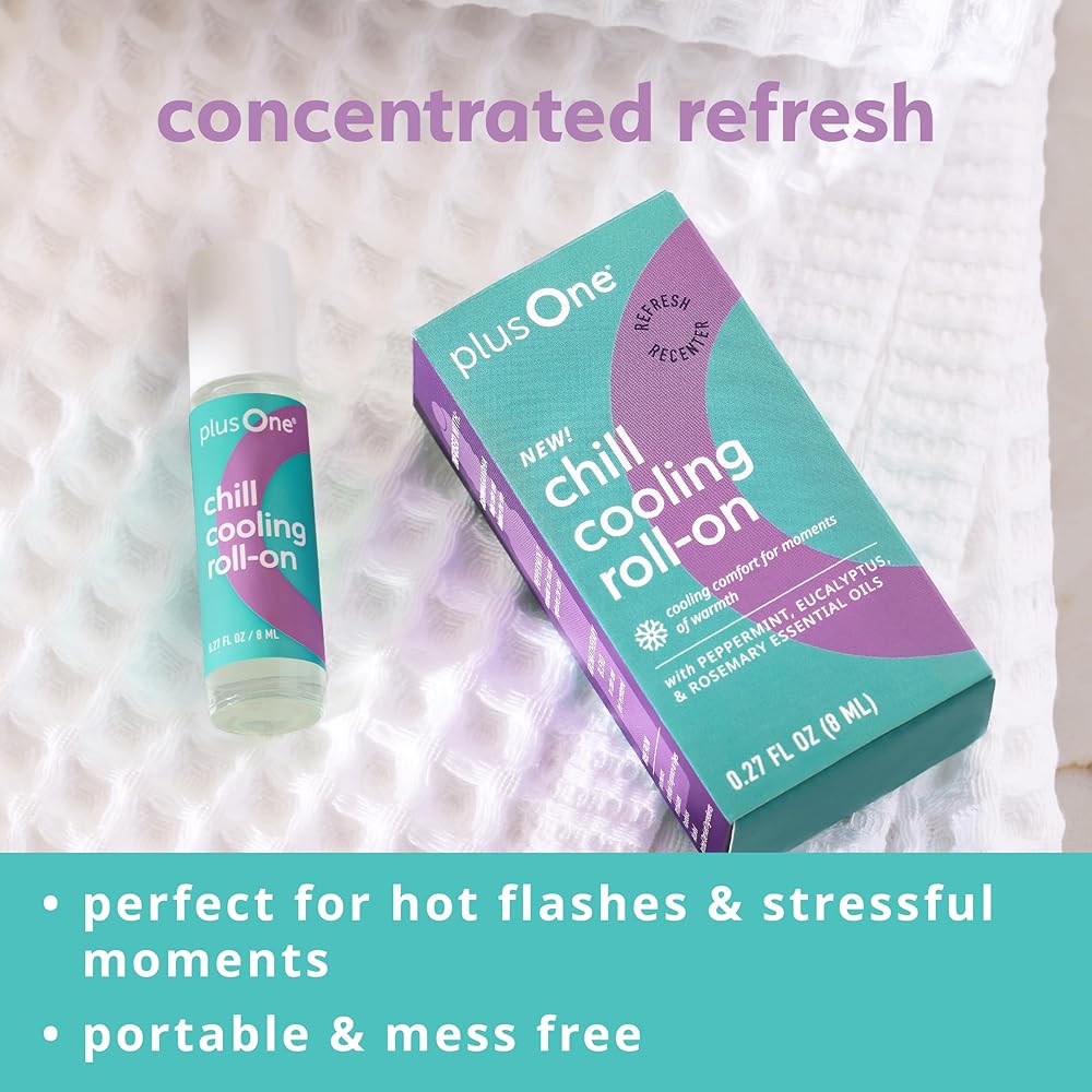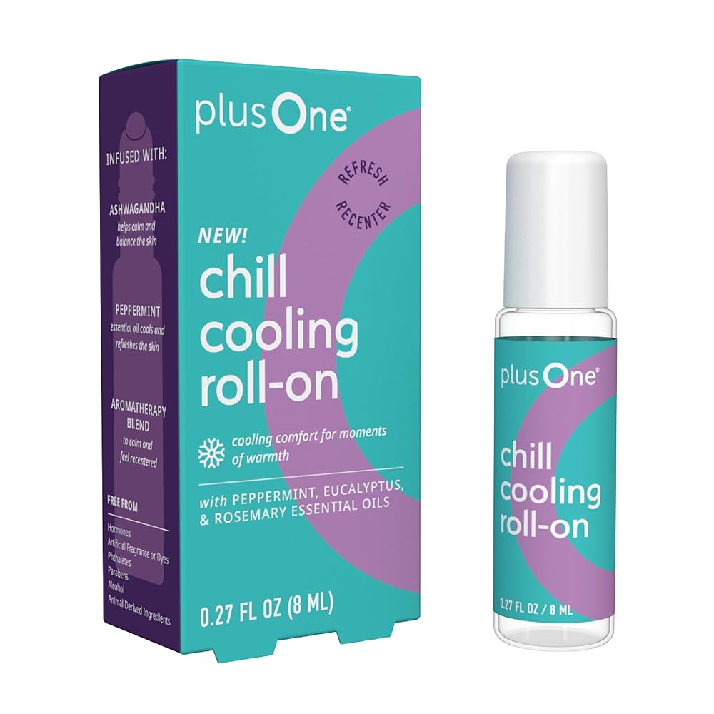 Calm the Heat. Soothe the Senses. When the heat rises—whether from a hot flash, a stressful meeting, or a humid afternoon—you need support that works now. The plusOne Chill Cooling Roll-On is a concentrated essential oil blend designed to lower the volume on overheated skin and overstimulated senses. Think of it as a portable ""cool-down"" button you can carry anywhere. Why You'll Love the Chill Factor: Our formula isn't just a surface-level refresher. We've combined the immediate chill of menthol with the aromatherapy benefits of high-quality plant oils. As the peppermint and spearmint go to work cooling your pulse points, the scents of lavender and chamomile help ease the tension that often accompanies sudden temperature shifts. Powered by Nature, Not Hormones We know that ""life changes"" require gentle care. That's why our roll-on is: Hormone-Free: A safe, natural alternative for managing menopause symptoms. Adaptogen-Infused: Uses Ashwagandha to help your skin stay balanced and resilient. Easy to Use: No messy sprays or heavy creams—just a targeted, cooling glide exactly where you need it. How to Use: Roll onto pulse points (wrists, temples, or the back of the neck) as needed. For maximum support during a hot flash, apply to the back of the neck and the inside of the wrists. Avoid the eye area.