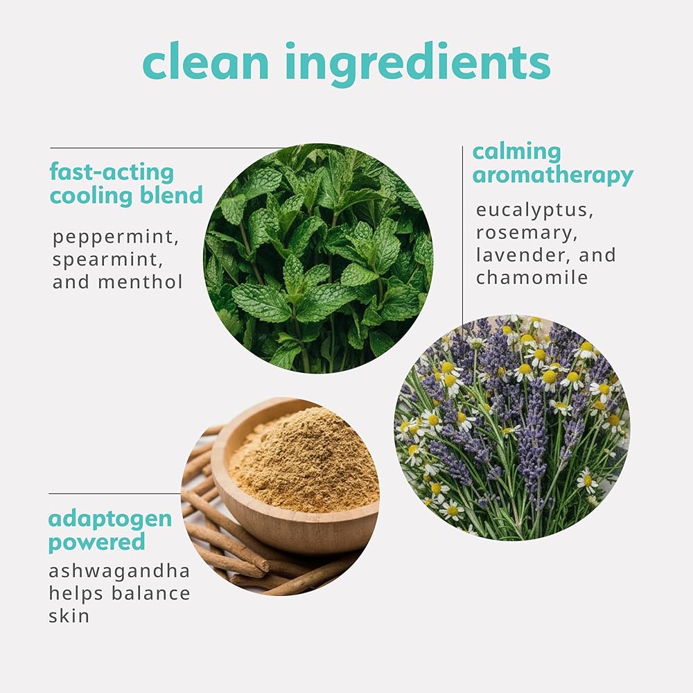 AROMATHERAPY & ADAPTOGEN SUPPORT: Beyond cooling, this blend features Lavender, Eucalyptus, Rosemary, and Chamomile to soothe overstimulated senses. Added Ashwagandha helps balance and calm the skin, providing a holistic approach to temperature swings and stress.