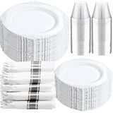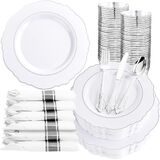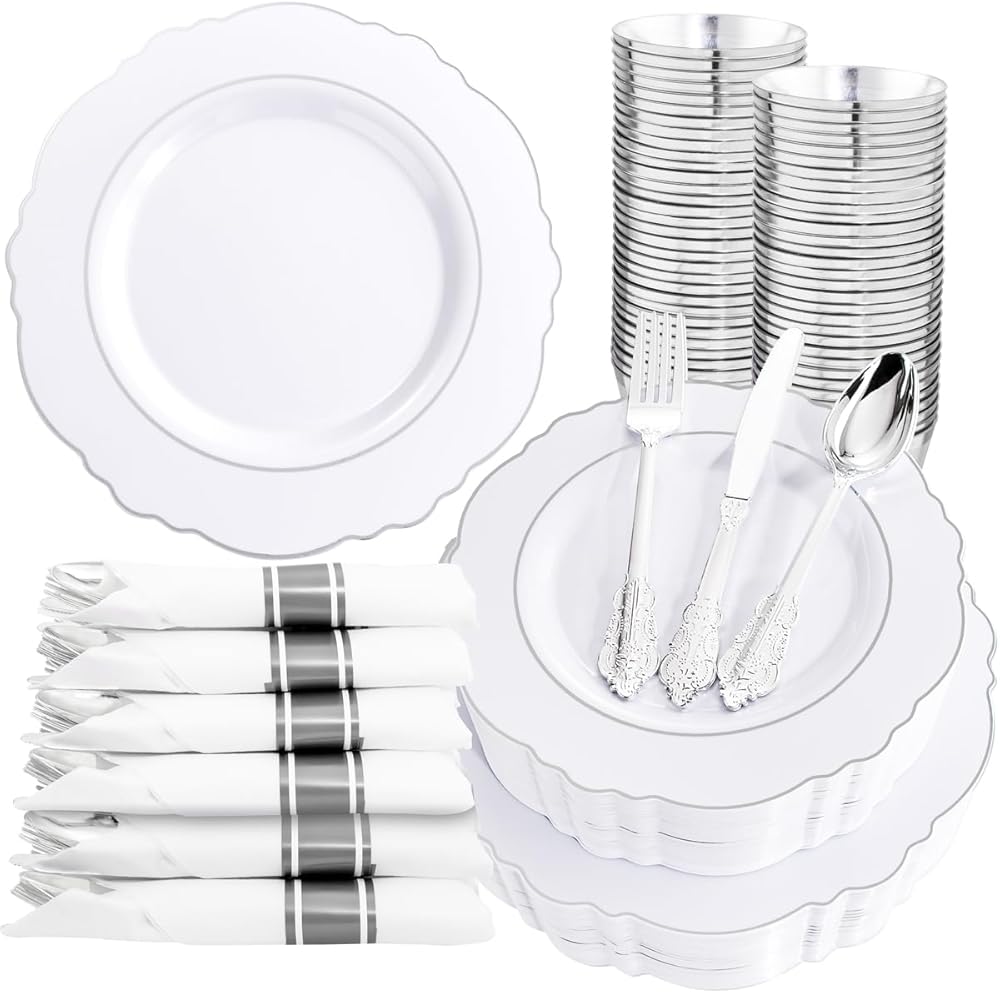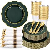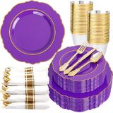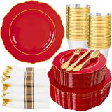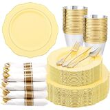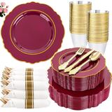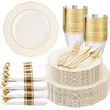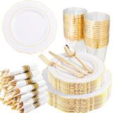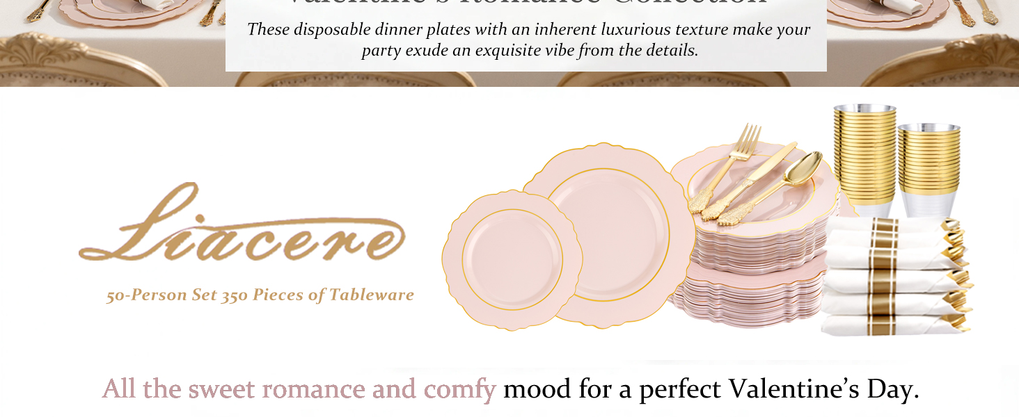PARTY ESSENTIALS ITEM: Liacere pink disposable plates are perfect for 50 guests, include 50 gold dessert plates, 50 gold dinner plates, 50 sets pre rolled napkins with gold plastic cutlery and 50 gold rim cups. These pink and gold plates can save time and effort in planning party and give your guests a surprising experience!