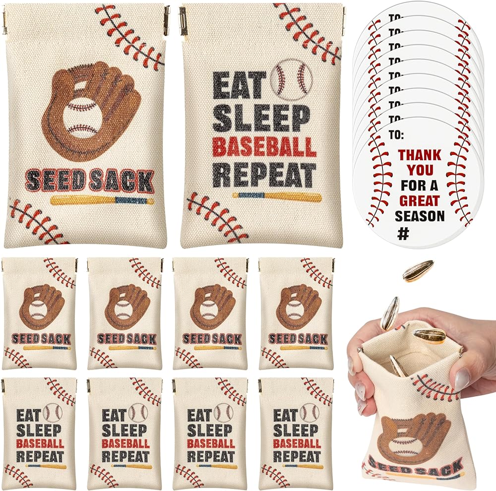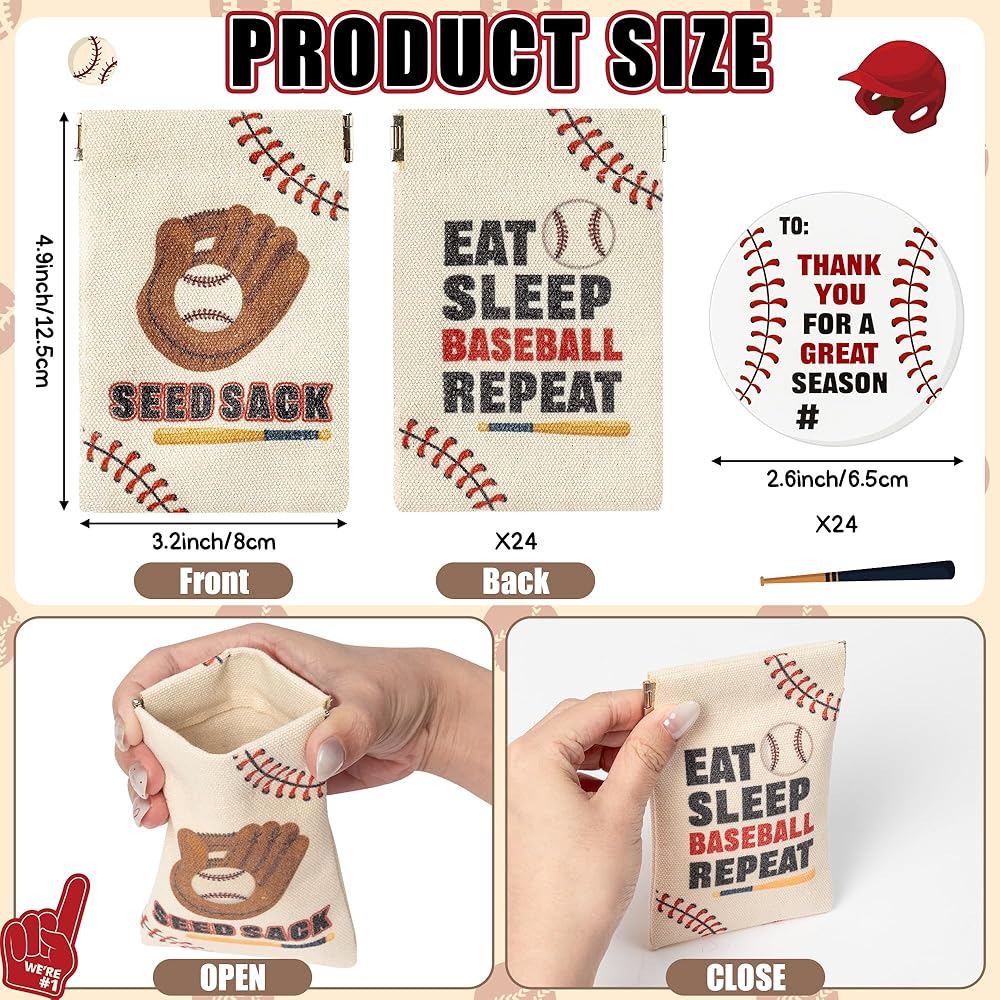 COMPLETE BASEBALL SEED SACK BAGS: This 48pcs bundle includes 24 seed sack bags and 24 matching circular cards. Perfect for baseball team gifts, party favors, or seed bags for game days, practice treats, and team celebrations