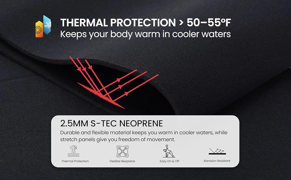 2nd GEN "S-Tec" NEOPRENE: 2.5mm neoprene (works best for temps down to 50-55F degrees) Closed, high density foam made up of thousands of tiny air bubbles (cells) which provide an installation barrier to slow down the conduction of heat