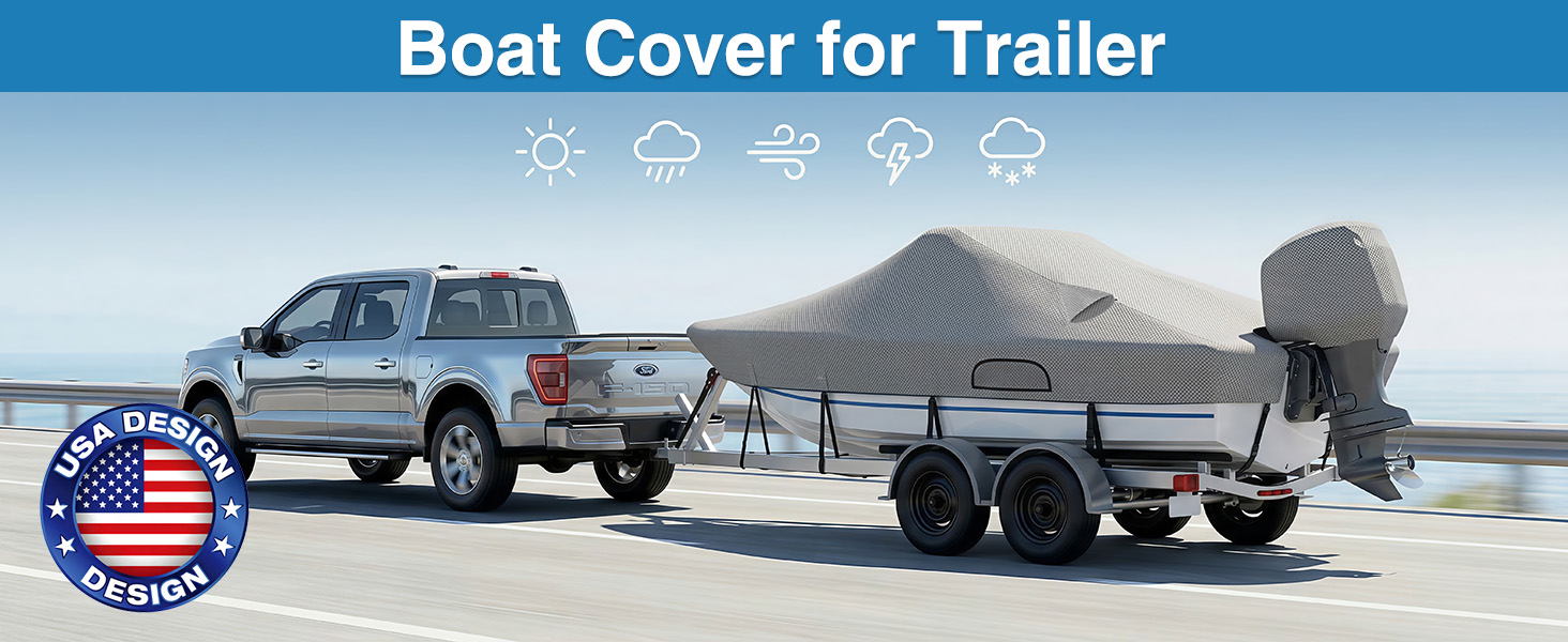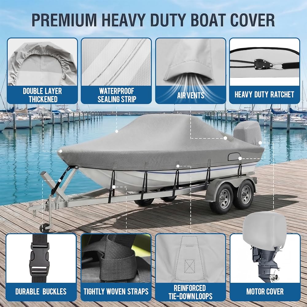WIDE BOAT COMPATIBILITY:Designed to fit many16-18.5 ft bass boats, V-hull, tri-hull, and Jon boats up to 94 inches wide. This boat cover with ratchet to tighten also includes a 1200D motor cover and storage bag, giving you added protection for the engine and a cleaner way to store everything.