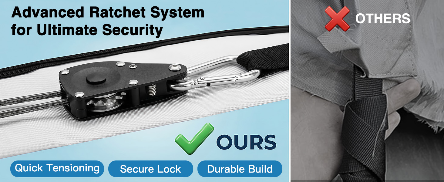 RATCHET TIGHT FIT:Say goodbye to loose elastic hems. This ratchet boat cover uses a secure tightening system to cinch the cover for a snug fit during storage, mooring, or trailering. A boat cover with ratchet strap design helps reduce flapping, shifting, and rain sneaking in around the edges.