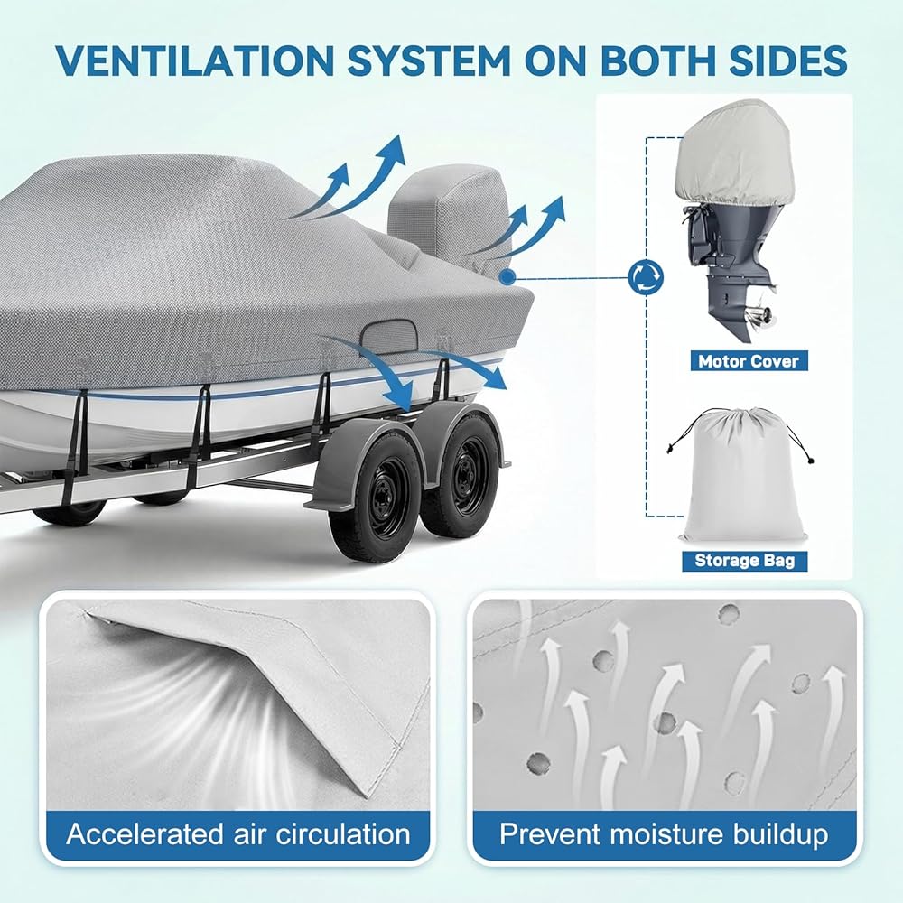 WATERPROOF YET BREATHABLE:Keep your interior better protected from rain, spray, and trapped moisture. Triple PU coating, waterproof seam tape, and dual rear vents help this mooring boat cover shed water while promoting airflow, reducing damp buildup and helping protect seats, electronics, and gear during outdoor storage.