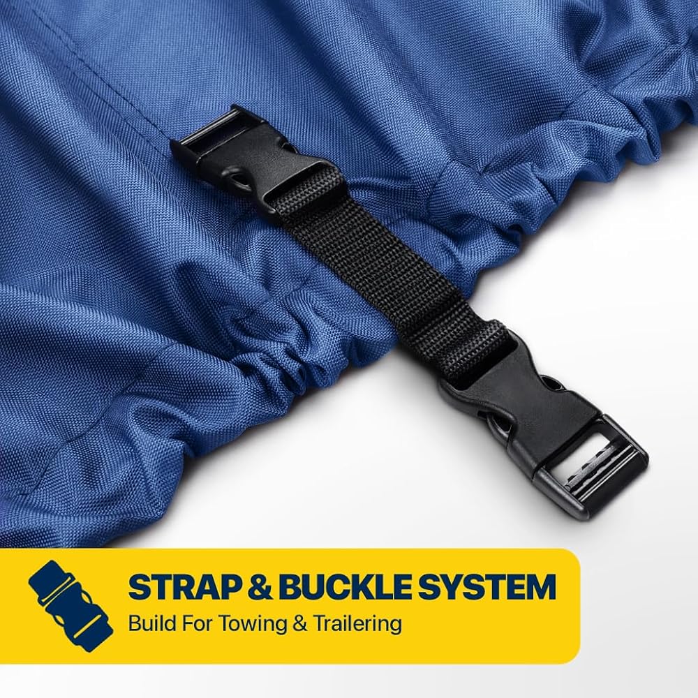 𝗦𝗡𝗨𝗚 𝗙𝗜𝗧: Elastic hem and adjustable straps with durable buckles provide a snug, wind-resistant fit that keeps the cover securely in place during transport and storage.