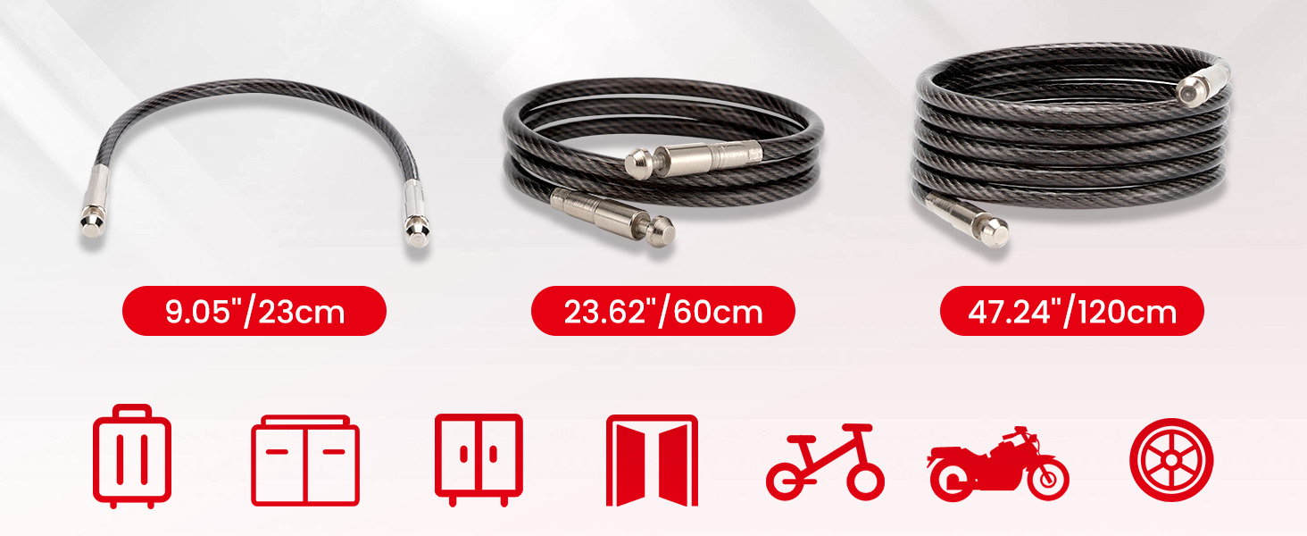 High Flexibility: This combination cable lock comes with 3 steel cables in different lengths (11.8 inches/30 cm, 23.6 inches/60 cm, and 47.2 inches/120 cm), which are easy to detach and replace, making it suitable for various locking needs