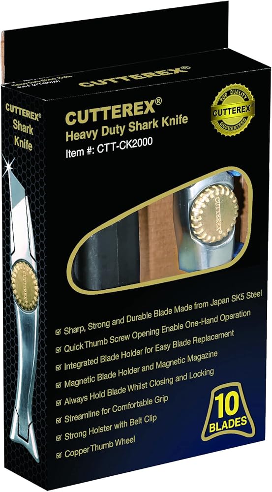 The CUTTEREX Shark Knife is one of the most popular fitter's tool on market that accepts most utility and hook blades. Comfortable, positive grip and easy blade replacement with copper thumb screw opening. Integrated magnetic blade holder and magnetic blade magazine to hold blade in place whilst closing and locking. Supplied with holster / belt clip and 5 blades. Total Length: 7-1/8” Net Weight: 5.0 oz