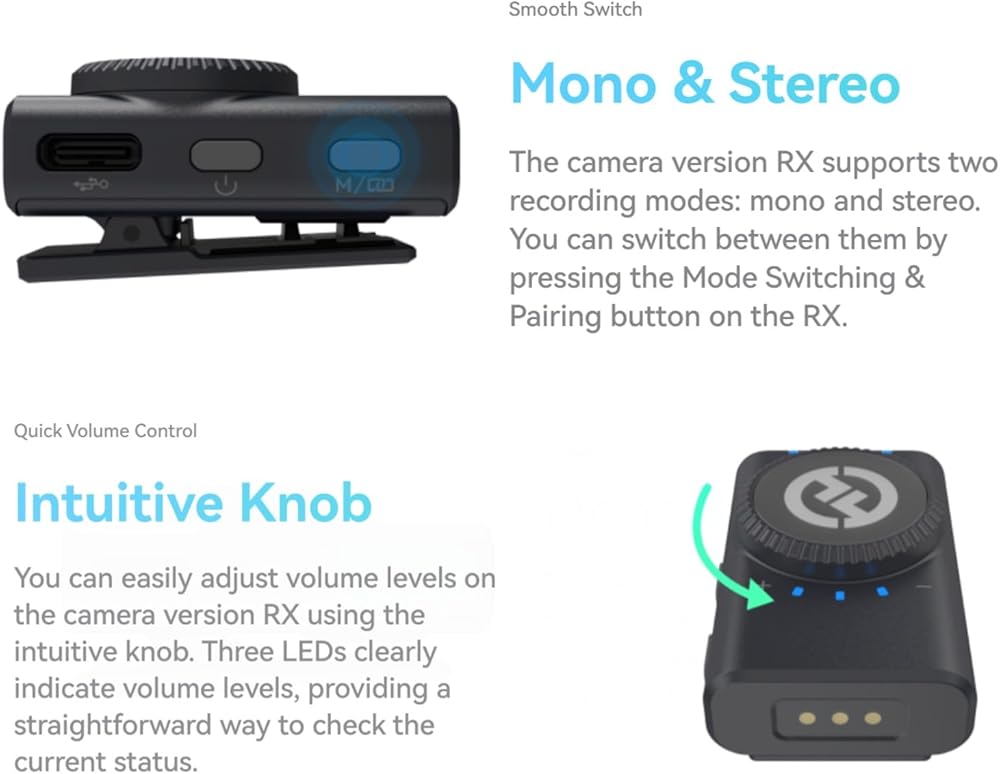 [Smooth Switch Between Mono & Stereo] The Lark M2 receiver of the camera version supports two recording modes: mono and stereo. You can switch between them by pressing the Mode Switching & Pairing button on the receiver. Note: The receiver supports switching between mono and stereo modes only when connected to the camera through the 3.5mm audio jack