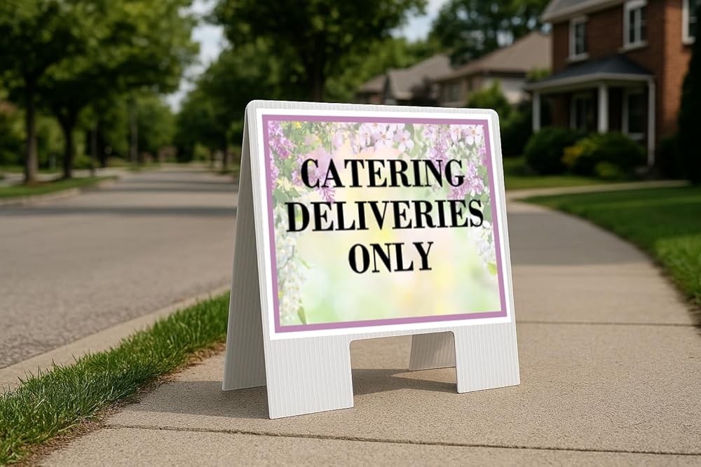 Catering Deliveries Only Spring Flowers Purple Lilac Up Arrows A-Frame Single Sided 23x23 in. sign in Kuwait