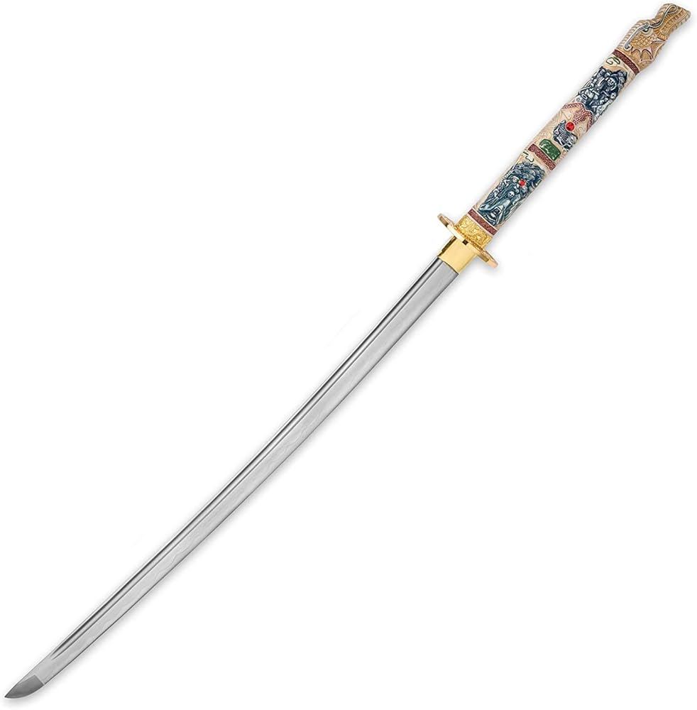 The Highlanders would definitely have held our Highlander Closed Mouth Dragon Katana in high regard. It features an intricately detailed faux ivory handle which resembles a hand carved, closed mouth Japanese dragon. The handle is colorfully hand-painted and features inset faux rubies. A golden metal alloy tsuba and habaki lead down to the 27 3/4” 1045 high carbon steel blade, which has a deep blood groove. The incredible katana comes sheathed in a navy blue lacquered scabbard with gold metal alloy, decorative accents to match the tsuba.