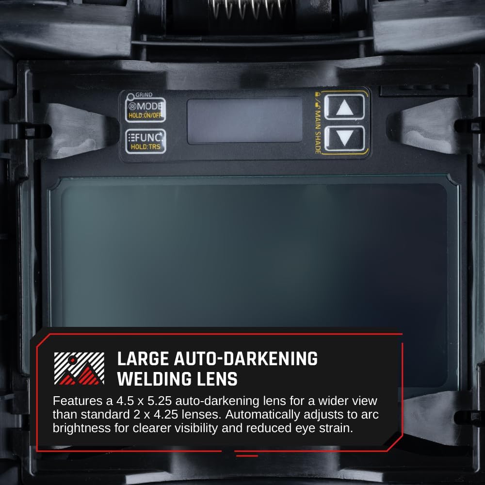 AUTO-DARKENING WELDING LENS, WORK FASTER, SEE CLEARER: Features an integrated auto-darkening welding lens that instantly adjusts to arc light, eliminating the need to flip shields or swap helmets. Ideal for MIG, TIG, and stick welding with seamless transitions between welding and grinding.