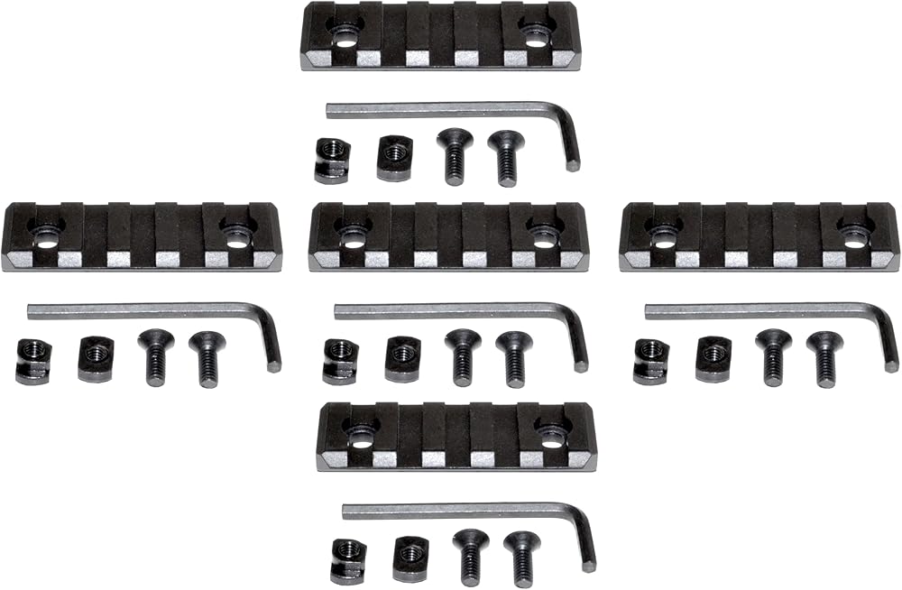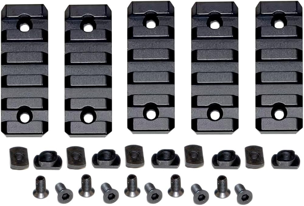 Kexuan 5 Slot compatible with M lok Style Single Picatinny Aluminum Alloy Rail, 5 Slots Easily add extra Picatinny slots to any compatible with M lok style mount system for added accessories with these additional Picatinny rail sections All sizes are constructed from Aircraft-Grade Aluminum Alloy (A6061-T6) Includes: - (5) 5 slots, (2.28″ length) - (10) Screws - (10) T Nuts - Hex Wrench