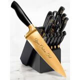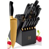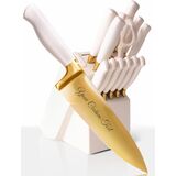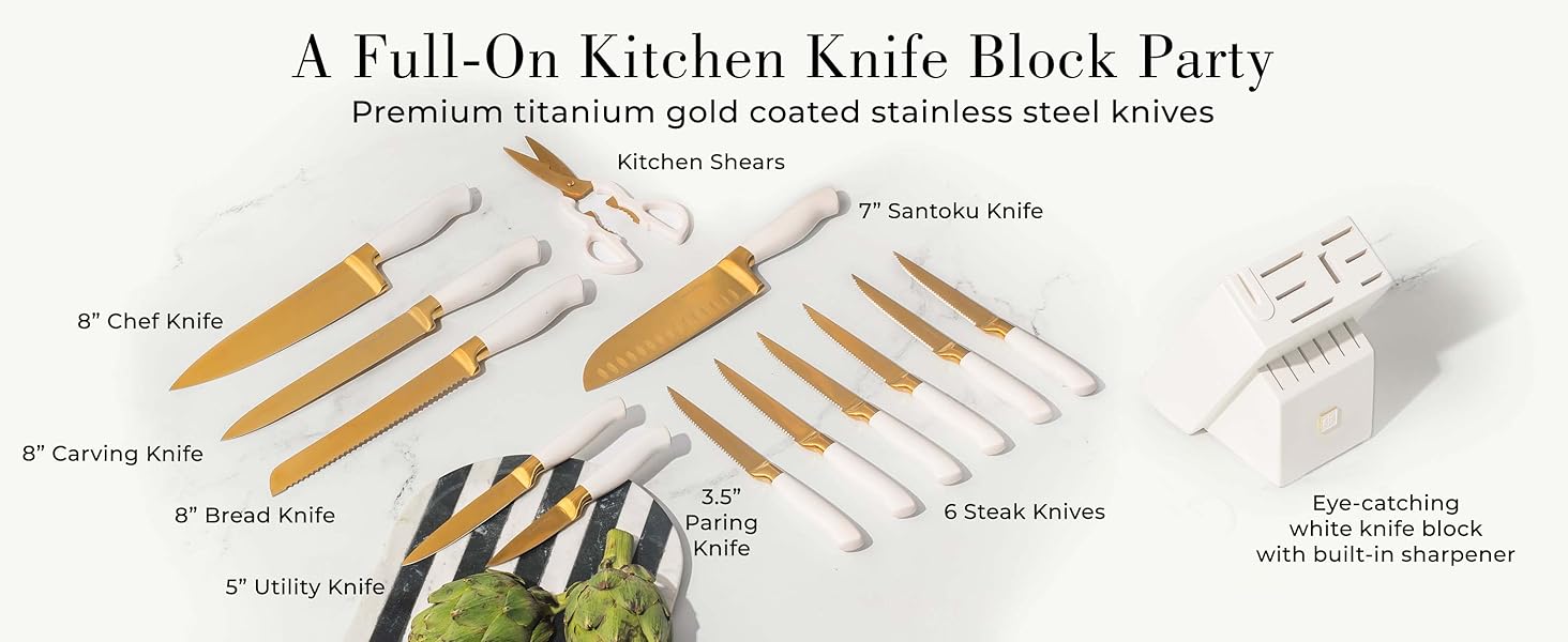 From Everyday Meals to Elegant Dinner Parties – One Set, All the Versatility: Whether you're meal-prepping for the week or plating up a five-star feast, this white kitchen knife set with the block is your go-to. With 14 essential tools—including chef's, carving, bread, utility, paring, santoku, 6 gold steak knives and kitchen shears—every moment in the kitchen is covered.