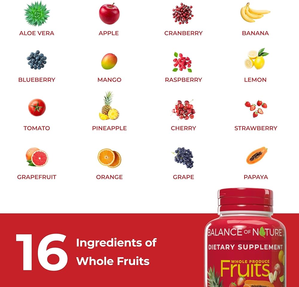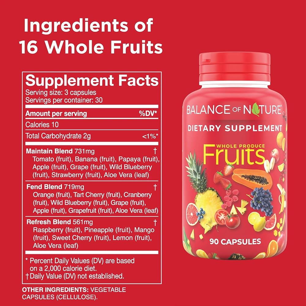 - Fruits Supplement: Balance of Nature Fruits supplement is ingredients of aloe vera, apple, banana, blueberry, cherry, cranberry, and more