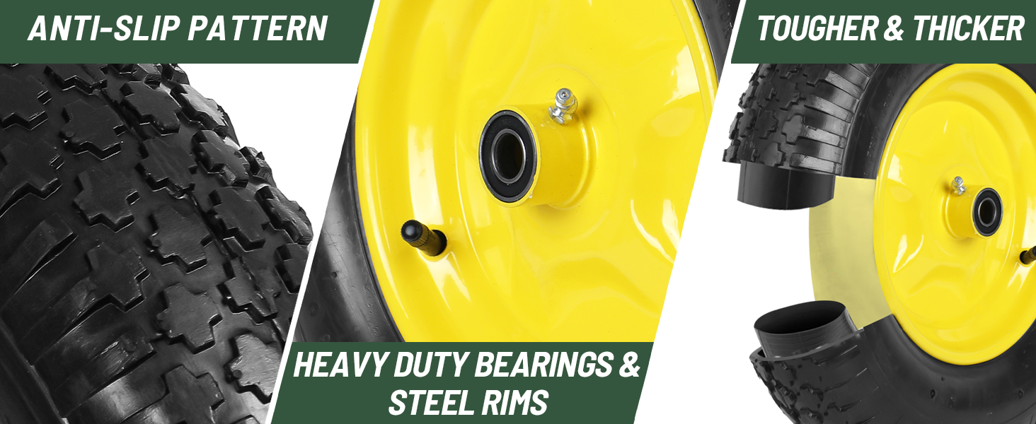 【Specifications & Applicable Models】:Upgrade your equipment with our 16" air rubber tires and wheels, a resilient alternative to 4.80/4.00-8" tires. Wheel Bearing: 5/8", Axle Hole Length: 3", Iron Hub Diameter: 8.6", Width: 3.8". Load Capacity: 400 lbs/wheel. Works well with trailers, carts, wheel barrows, garden carts, wheel barrows, Wagon, Hand Truck and other types of outdoor power equipment