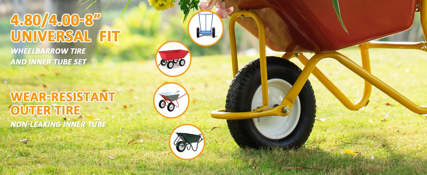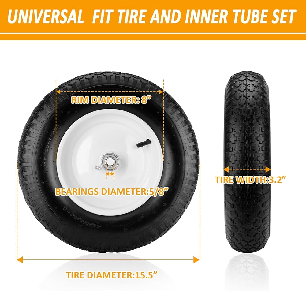 4.80/4.00-8" Air Filled Wheelbarrow Tire,Heavy-Duty Replacement Tire and Inner Tube Set with 3/4 & 5/8 Wheel Bearing and Spacer Kit included,Tubed Tires Non-Slip for Garden Cart Wagon (White)
