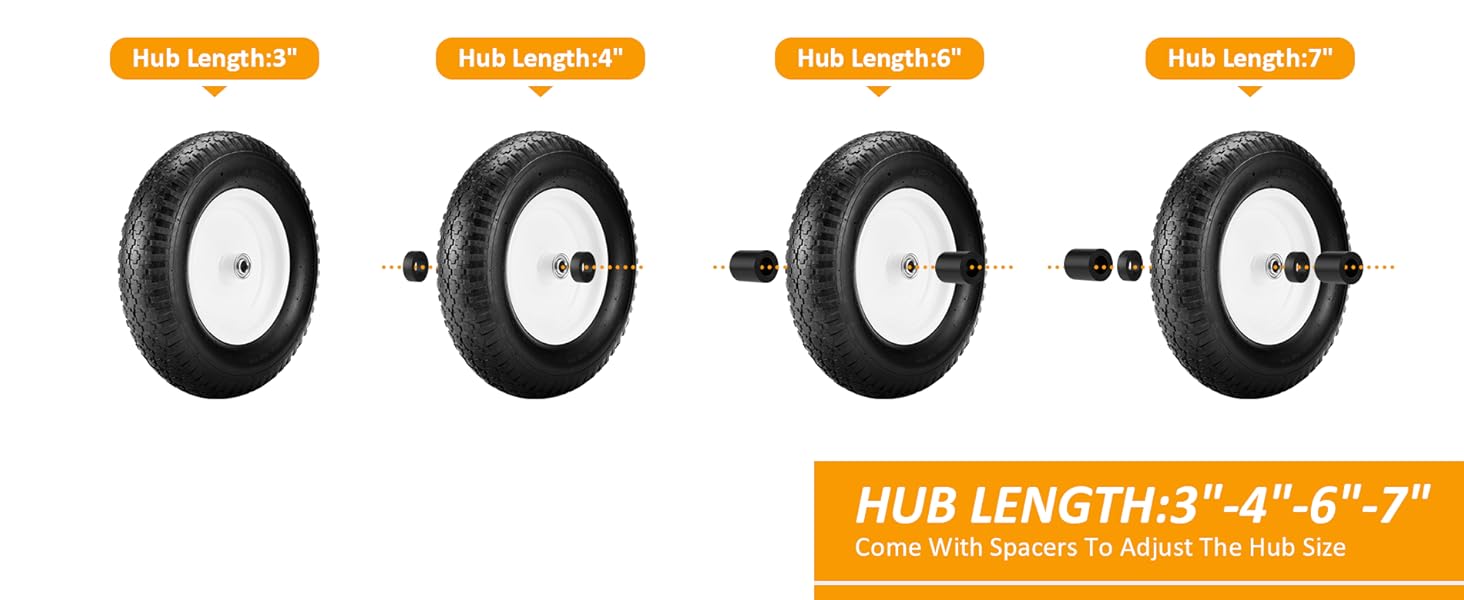【Universal Fit Hub Length 3-7 inch】Centered hub: 3", comes with additional plastic spacers for extendable hub length to 7". Fits most wheelbarrows and other small lawn and garden equipment.Please measure and make sure your original wheel barrow wheel's hub length.