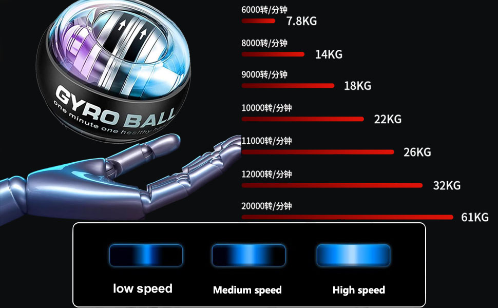 : Hold the wrist ball tightly and then release yours thumbs off the rotator immediately, the rotator will be running at the speed of 1500 to 3000 rpm. At the same time ,turn your palm down slowly rotating your wrist to get the power to maintain the existing gyro ball or higher than the starting speed.