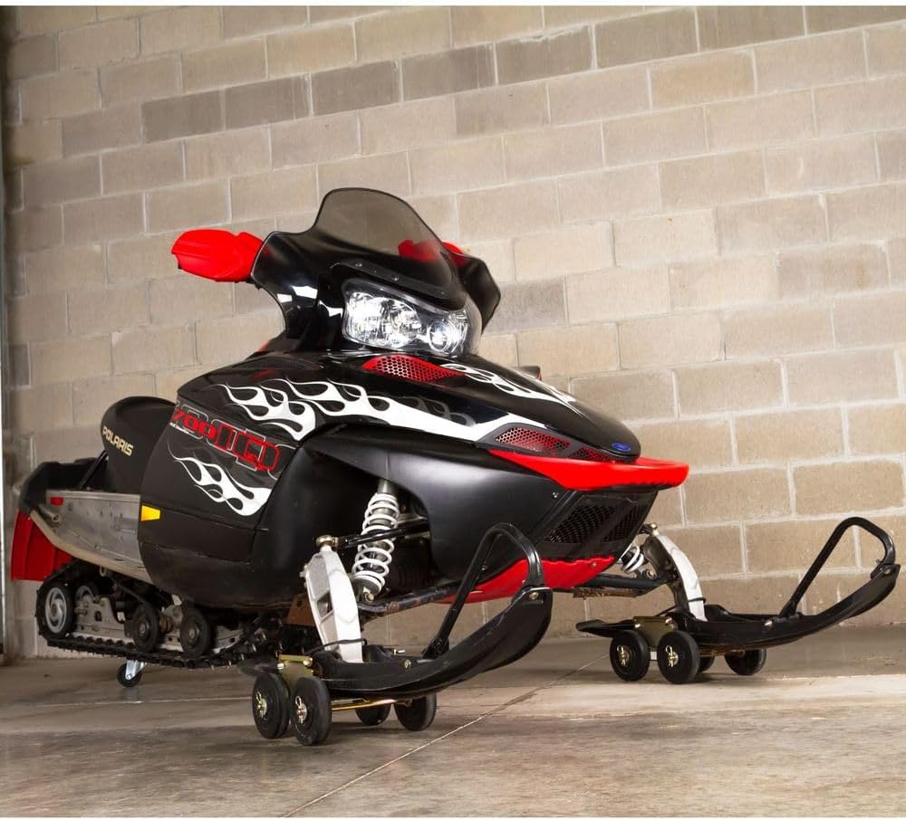 CONVENIENT SET: Set comes with two ski dollies with a heavy-duty coated steel cable strap and one track dolly in order for snowmobile to be fully off the ground