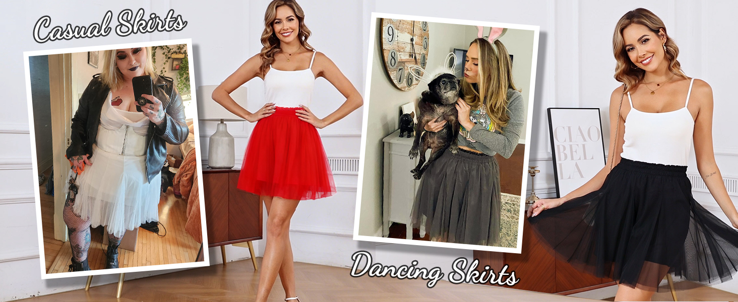 Features: Comfortable elastic waistband fit a range of sizes, 2 layers soft tulle, 1 layer lining, A-line shape, Mini/above knee length