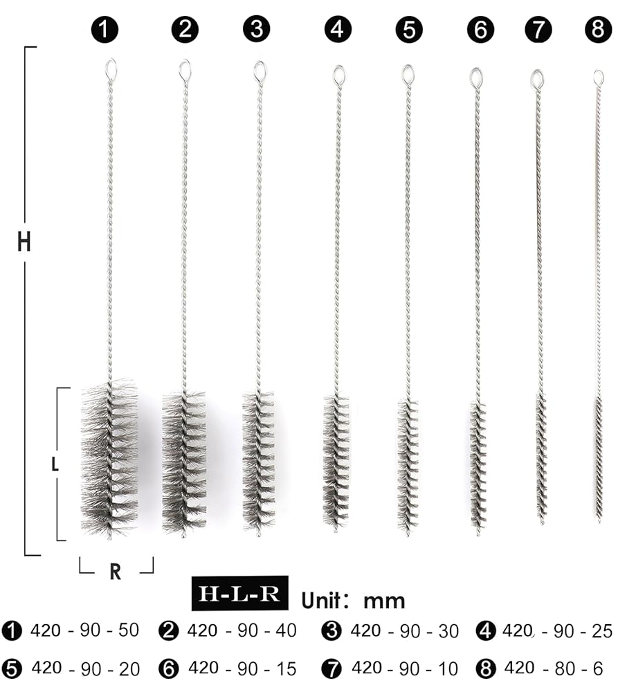 8 Different Sizes Wire Tube Brush is very flexible use, wire brush go into a small round opening like a bolt hole to remove rust etc, Perfect for tubes, cylinders or narrow clean up requirements