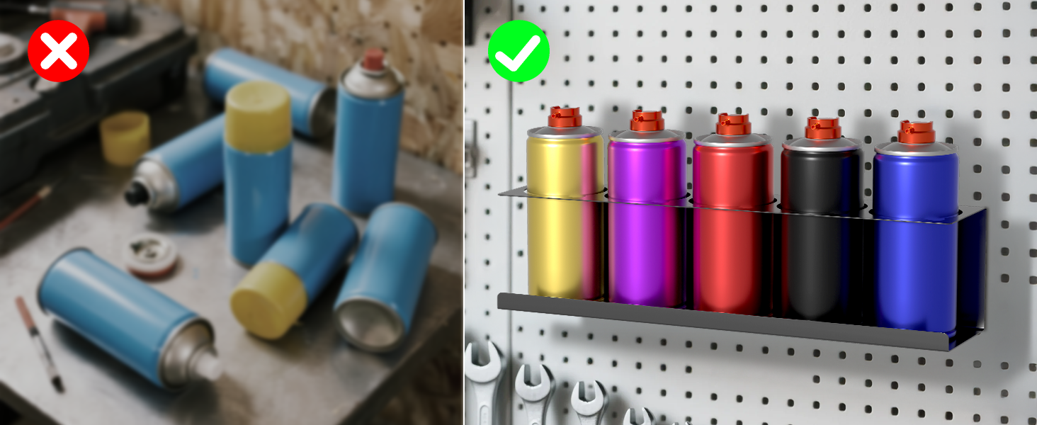 Save Space - The tool box spray paint can holder can not only be used as a spray bottle rack in the garage, but can also be placed in utility rooms, craft studios, and other places where bottles and cans need to be placed, freeing up space in tool boxes and pantries. The can organizer features an open design for easy storage and access