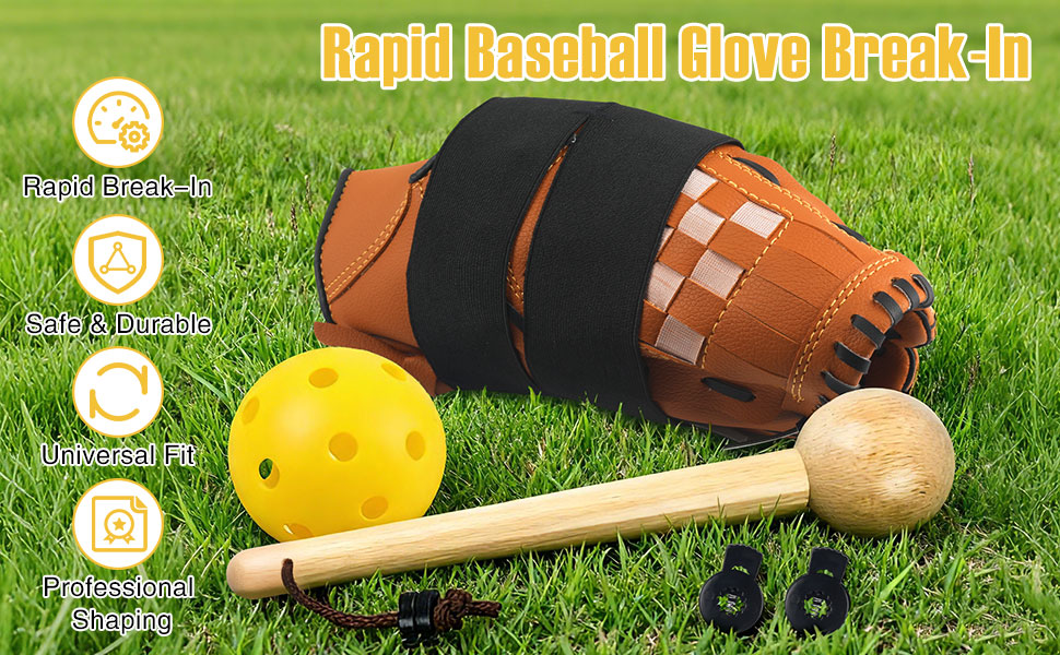 Package includes: 1 x Glove mallet 1 x Practice ball 2 x Wrap band 2 x Locks Why choose our product? 1. Reduce the risk of injury and protect the hands. 2. Improve hitting efficiency and win the game. 3. Protect gloves and extend their lifespan. 4. Good quality, providing you with a satisfactory shopping experience. Please note that our products do not include baseball gloves.