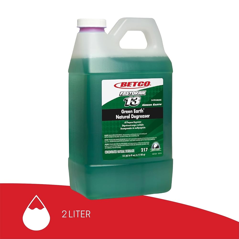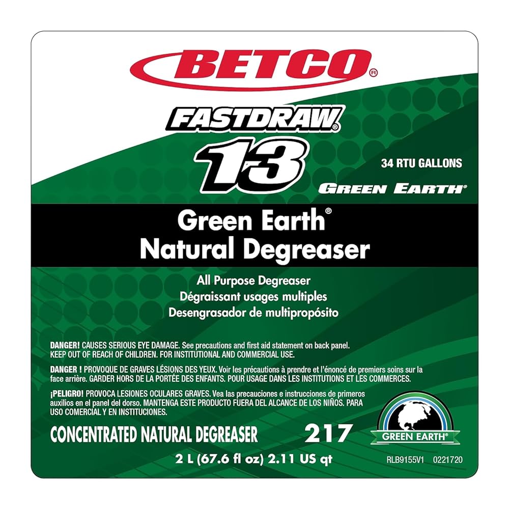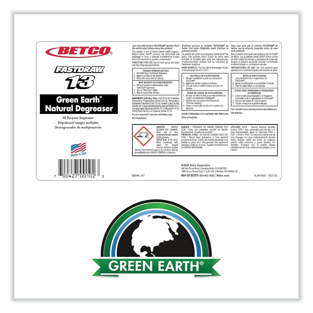 This powerful degreaser is the naturally preferred solution for all degreasing tasks. A synergistic blend of natural ingredients with a unique surfactant system produces a concentrated formula that equals most traditional degreasers. This unique degreaser breaks down greases, oils and fats including industrial petroleum greases on all water-safe surfaces. Green Earth Natural Degreaser removes inks, oils, greases and fats from a variety of surfaces with a proprietary blend of natural, bio-renewable/bio-based ingredients. Dilution ratio is 1:64. As part of the FastDraw system, it is numbered (FastDraw 13) and color-coded to eliminate misuse. Spill-proof bottle helps prevent chemical contact with the cleaning staff. Patented technology uses two metering tips for low-flow and high-flow dilution. Curved siphon tubes on the FastDraw Dispensers (sold separately) allow complete product evacuation, eliminating waste.