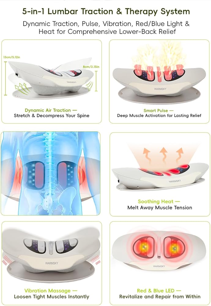 Smart Custom Modes & Timed Session Control - Choose from 3 intelligent programs or personalize your own settings with adjustable intensity levels and traction height. Sessions can be set for 10/15/20 minutes for convenient, consistent use. Perfect for those sitting long hours, drivers,postpartum mothers, athletes, and seniors seeking gentle lumbar support.