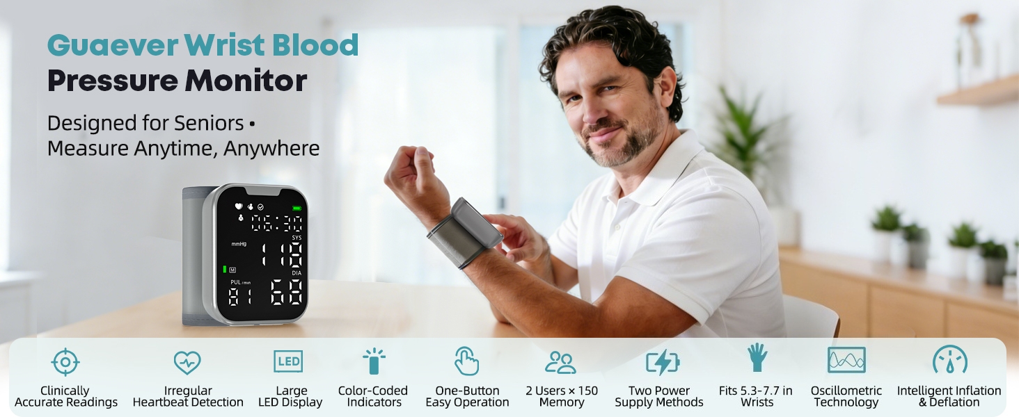 Clinically Accurate Smart Measurement with Alerts:Designed for clinically accurate results, Guaever wrist blood pressure monitor measures systolic, diastolic, heart rate, and detects irregular heartbeat. Smart reminders help correct wrong posture and indicate heart rate detection status.