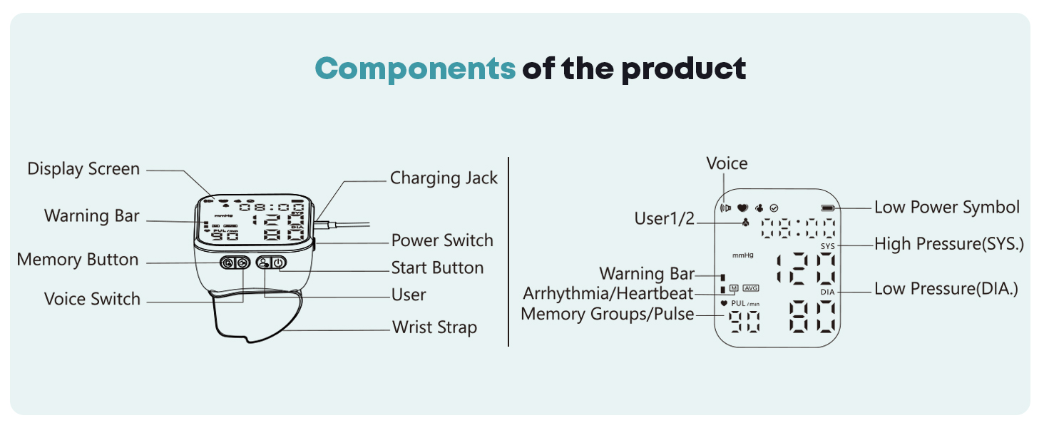 Adjustable Wrist Cuff & Dual User Memory:Adjustable cuff fits 13.5–19.5 cm (5.3"–7.7"). Supports 2 users × 150 readings with last 3 measurements average.