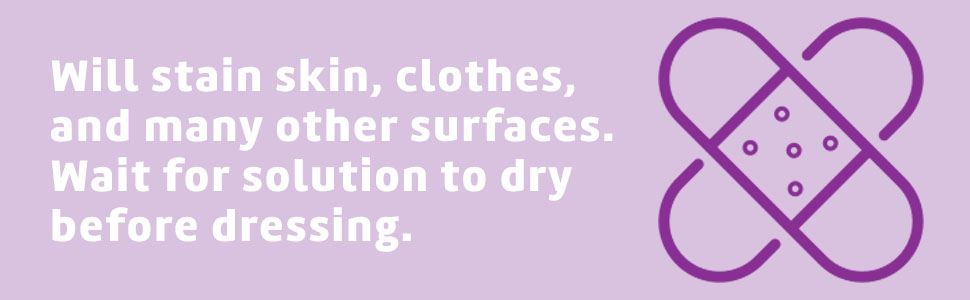 Gentian Violet topical solution will stain the skin but will wash away eventually. To avoid purple staining in clothes, apply the violet medicine and wait for it to dry before dressing.