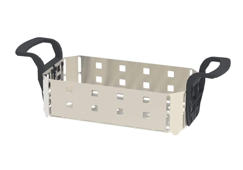 With their open mesh bottoms, these stainless steel baskets are designed to maximize the cleaning action reaching the parts while keeping them from contacting the bottom or sides of the ultrasonic cleaning tank. The baskets hang from the top rim of the tank so that parts being cleaned are fully immersed in the cleaning solution. It is not advisable to place parts to be cleaned directly on the bottom of the tank because they can abrade and damage the vibrating surface as well as the parts themselves. Heavy parts positioned on the tank bottom can suppress the ultrasonic action reducing cleaning effectiveness. Plastic insulation on the basket handles makes it easy to remove the basket from the tank while warm.