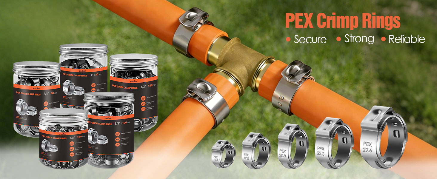 【120-Pack Value Jar & Multiple Sizes Available】Includes 120pcs of 3/8" stainless steel PEX clamp rings in a reusable storage jar. Available in 1/2", 5/8", 3/4", and 1" sizes via the size dropdown to fit your full PEX system.