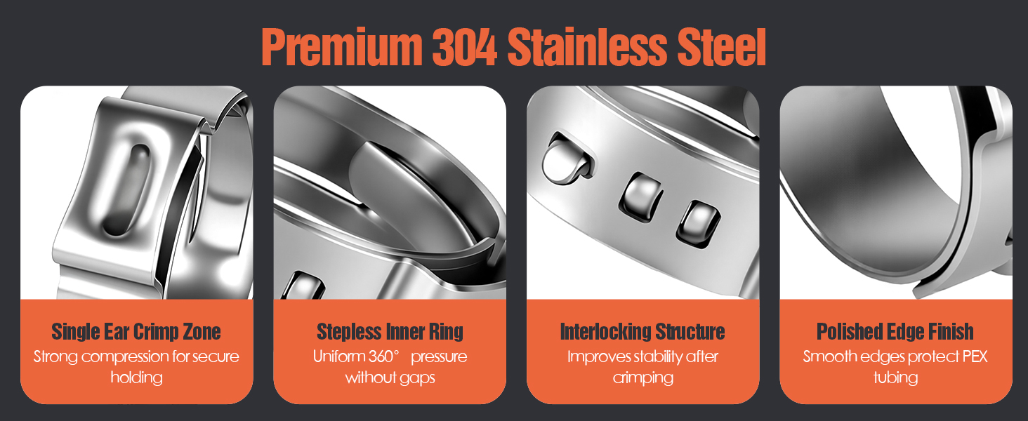 【Secure Leak-Proof Seal for PEX Connections】These 3/8" PEX cinch clamp rings provide a tight, reliable seal by applying even 360° compression around fittings. Helps reduce leaks caused by loose connections, uneven clamping, or long-term vibration.
