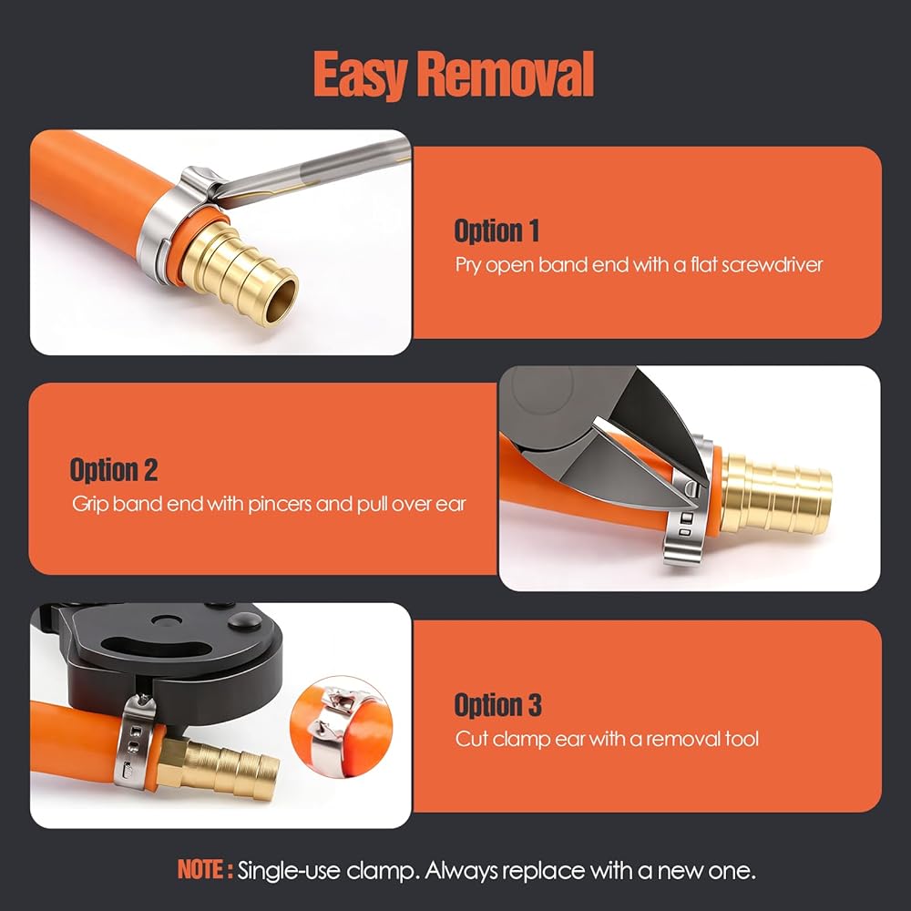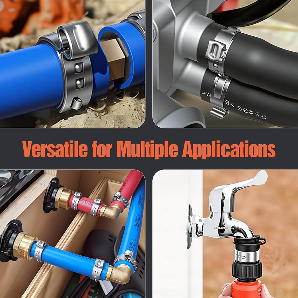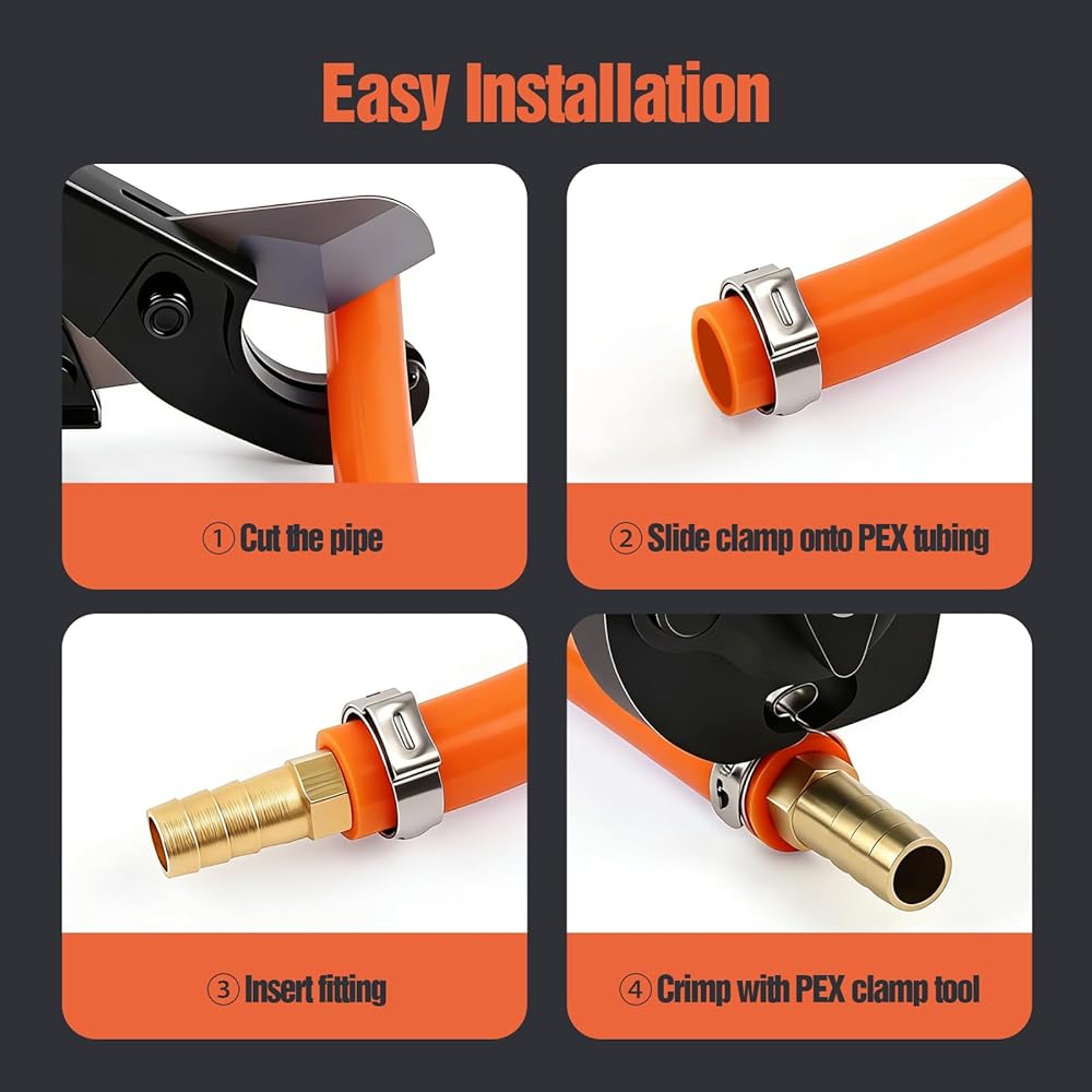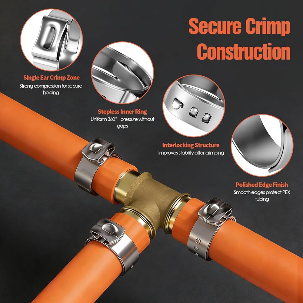 【Smooth Edge & Easy Installation】Designed with smooth inner edges to help reduce the risk of scratching or damaging PEX tubing during cinching. Compatible with most standard 3/8 inch PEX cinch clamp tools—simply slide, insert the fitting, and cinch securely in seconds.
