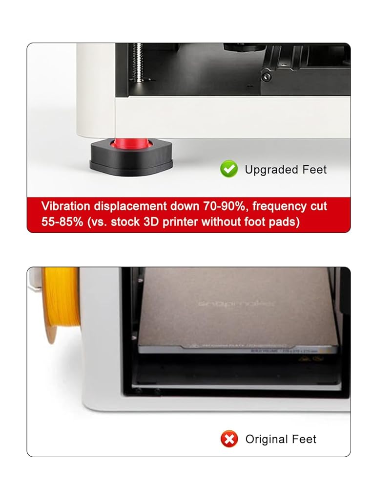 Damping Tech: Anti-vibration feet absorb 90%+ vibration/noise, letting you enjoy smoother prints, better precision and fewer movement artifacts.