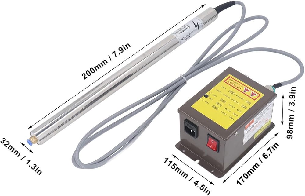 1. [HIGH EFFICIENCY]: Fast static elimination speed with a 5.6KV output power, suitable for power devices.2. [GOOD PERFORMANCE]: Densely arranged ion discharge needles for high ion release density and better electrostatic elimination.3. [APPLICABLE RANGE]: Ideal for static elimination of thin films, wide workpieces, and large working spaces.4. [STAINLESS STEEL ION NEEDLE]: to and oxidation, suitable for various environments.5. [WIDELY USED]: for electronic assembly, biological products, film composite, injection printing, etc.Specification:Item Type: Ionizing Air BarMaterial: Steel, CopperStatic Elimination Speed: 0.5sIon Balance: 35VOperating Environment: Dust , General Workshop, Temperature: 10-50℃, Humidity: Working Air Pressure: 0.4Mpa-0.8Mpa (recommended 4-8kg) Content:How to Use:1. Connect the ionizing bar applicable to the power supply to the output port, can connect one or two bars.2. Connect the power cord to the machine and plug it into the power supply.3. Turn on the switch to use.Package List:1 x Ionizing Air Bar