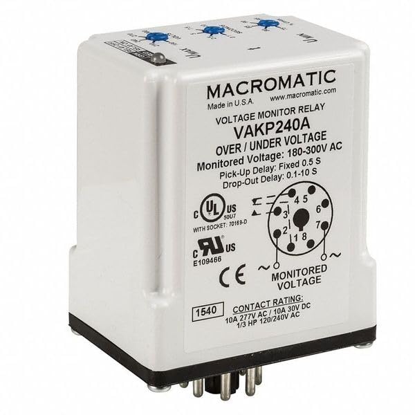 Price For: Each Pins: 8 Contact Amp Rating (Resistive): 10 Drop-Out Range: 75% to 95% Item: Voltage Sensing Relay Base Type: Octal Phase: 1 Contact Form: SPDT Pick Up Range: 180 to 300VAC Number of Contacts: 1 Trip Delay: 0.10 to 10 sec. Socket: 5X852 Input Voltage: 240VAC Country of Origin (subject to change): United States