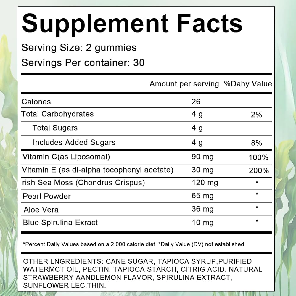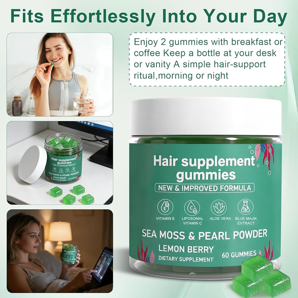 Hair Loss Gummies,Sea Moss Gummies with Vitamin C, Vitamin E, Aloe Vera, Pearl Powder Support Faster Hair Growth,Enhance Nail Elasticity,Promot Radiant Skin,Gluten-Free - 60 Count