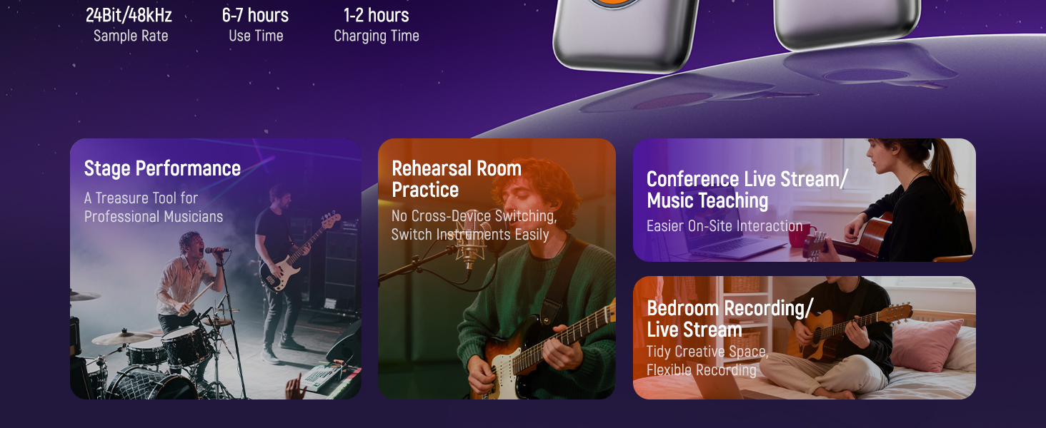 ✓[Studio-Quality Sound – Dedicated 5.8GHz Band] Worried wireless will kill your tone? This system runs on a dedicated 5.8GHz band, avoiding crowded 2.4GHz WiFi and Bluetooth interference. With 24-bit/48kHz sampling, 20Hz–20kHz response, and >95dB signal-to-noise ratio, it delivers lossless, CD-quality audio—every pick attack and harmonic comes through clean, just like a high-end cable.