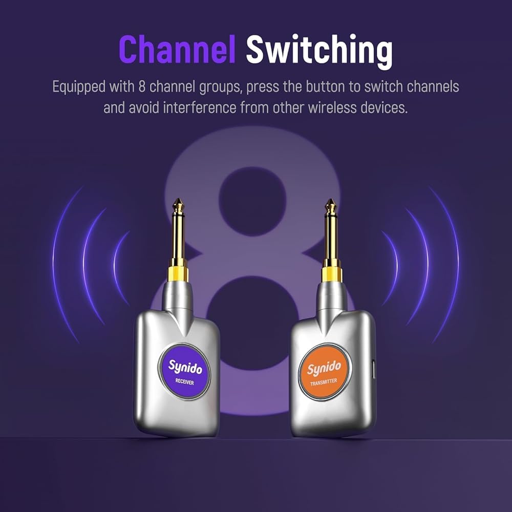 ✓[8 Simultaneous Channels – Band-Ready & Plug-and-Play] Running multiple wireless units? This system supports up to 8 channels simultaneously with no interference. Widely compatible with guitars, bass, electronic drums, keyboards, and PA systems—true plug-and-play, no drivers, no hassle.