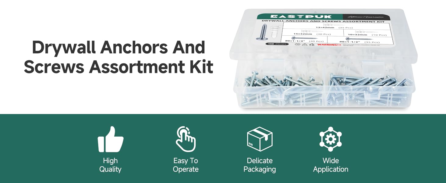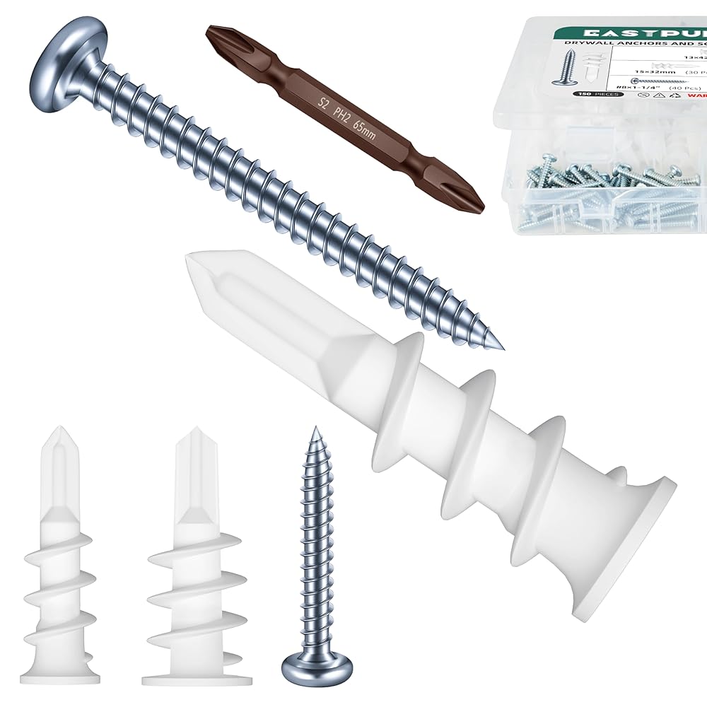 【Kit Contents】 The wall hanging kit includes 75 plastic heavy-duty drywall anchors, 75 assorted pan head screws, and one phillips drive bit. All components are organized in a compact storage box. Contains small parts—recommended for adult use and not suitable for children under 6 years old.