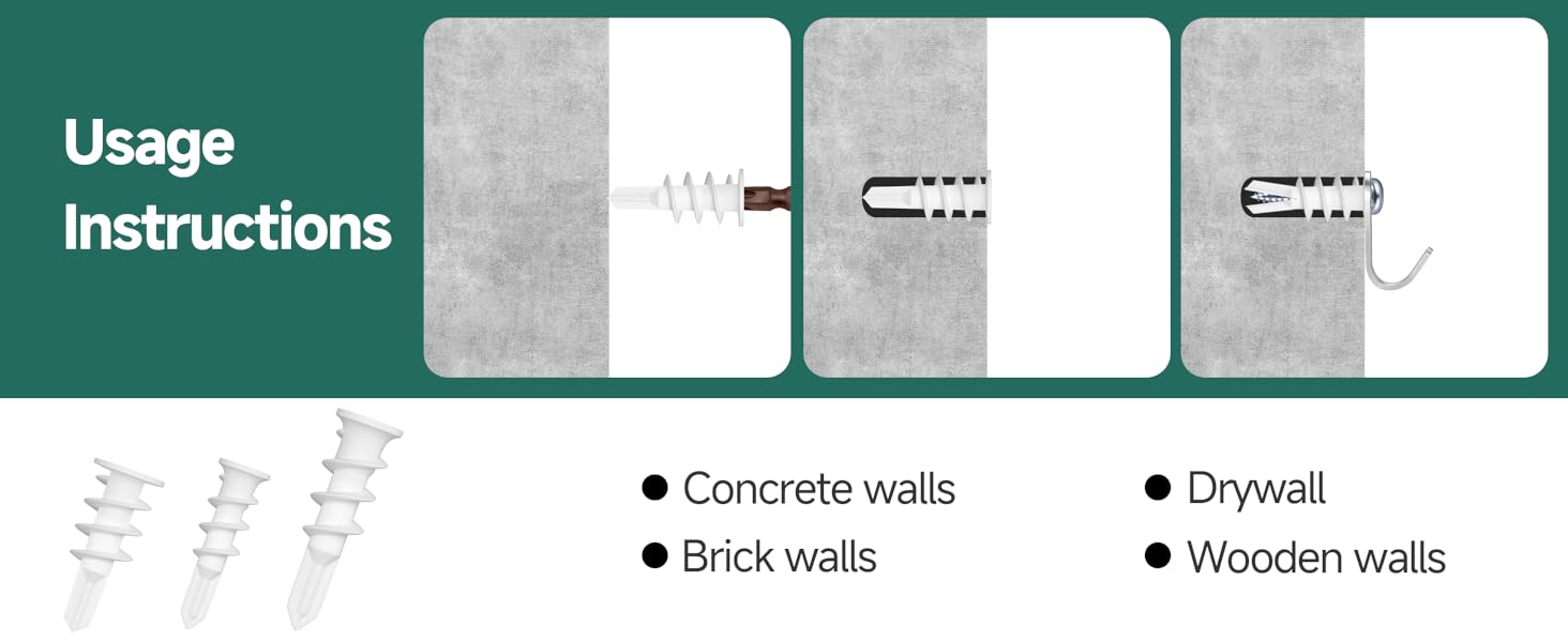【Simple Installation】 Dry wall anchors and screws kit. These self-drilling anchors feature a pointed tip design that eliminates the need for pre-drilling. They can be driven directly into drywall using a screwdriver. Once the wall anchor is in place, insert the screw to secure the fixture. The process allows for fast and straightforward installation.