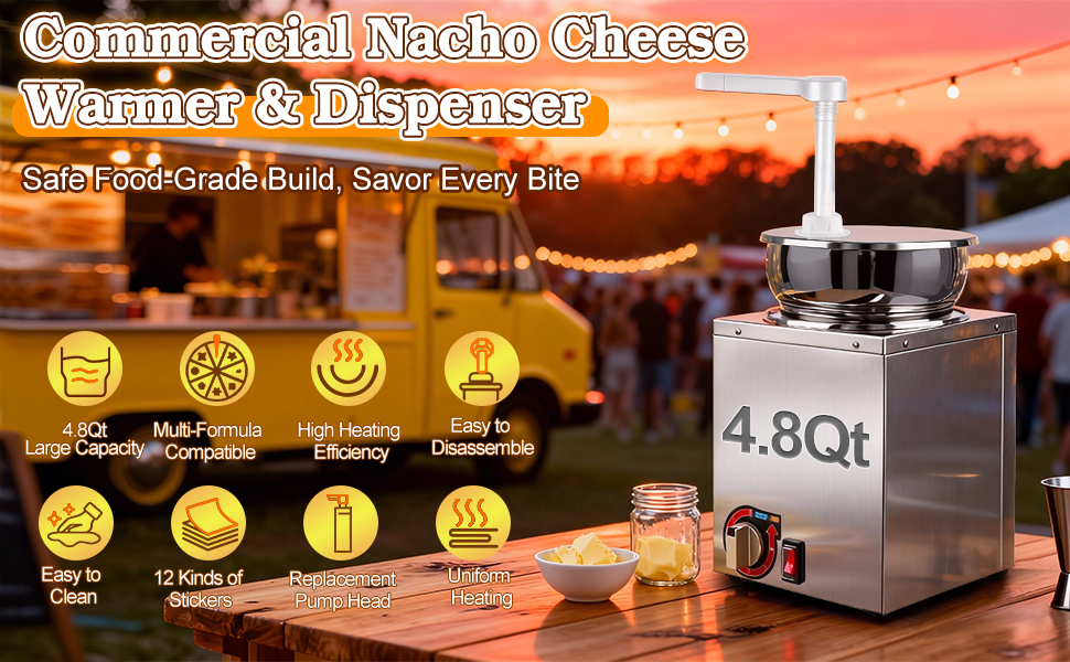 4.8Qt Nacho Cheese Dispenser, Nacho Cheese Warmer with Pump and 6-Level Temperature Adjustment, 600W 86-200℉ Hot Fudge Warmer with, Commercial Sauce Dispenser Machine for Syrup