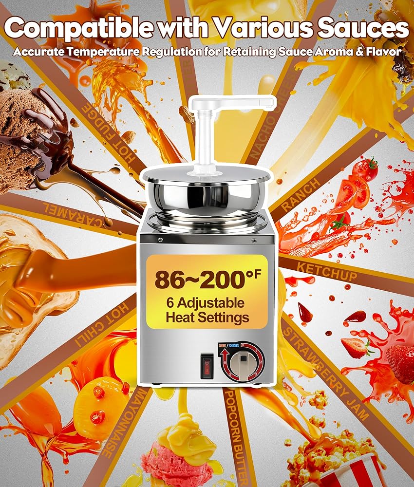 Equipped with a 6-level temperature control knob (86–200 °F / 30–96 °C) for fast, precise heating. The water-bath system eliminates hotspots and scorching, keeping cheese, caramel, ketchup, and more evenly warmed.