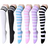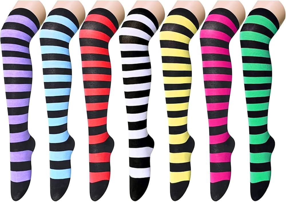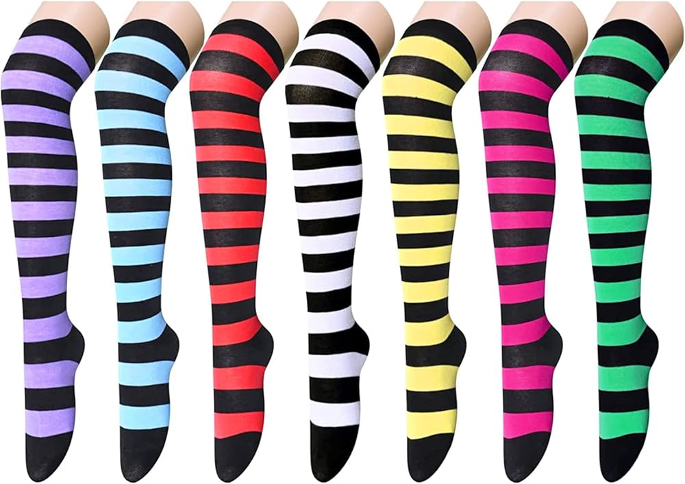 THIGH HIGH SOCKS: Each pair features bright colors and black stripes throughout. Choose from green with black stripes, pink with black stripes, yellow with black stripes, white with black stripes, red with black stripes, blue with black stripes, or purple with black stripes. Wear them with shorts or mini skirts to show off your energy and boost your confidence.