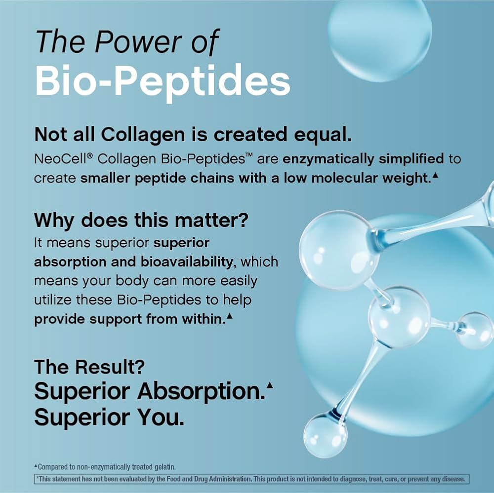 Superior Absorption Collagen: NeoCell Bio-Peptides are enzymatically simplified into smaller peptides to help support absorption.**